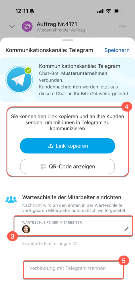 4. Kopieren Sie den generierten Link und senden Sie ihn dem Kunden im Chat, um ihn zum Telegram-Kanal einzuladen. Alternativ können Sie bei einem persönlichen Gespräch den QR-Code vorzeigen.