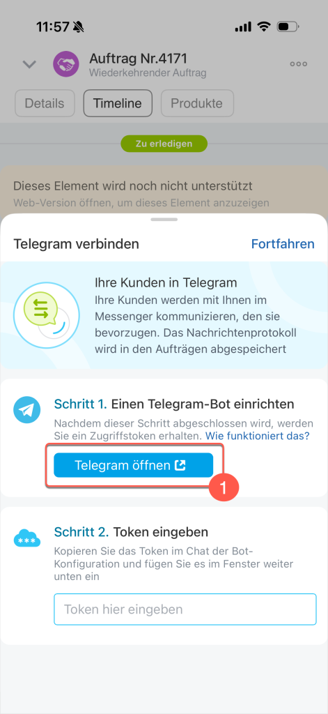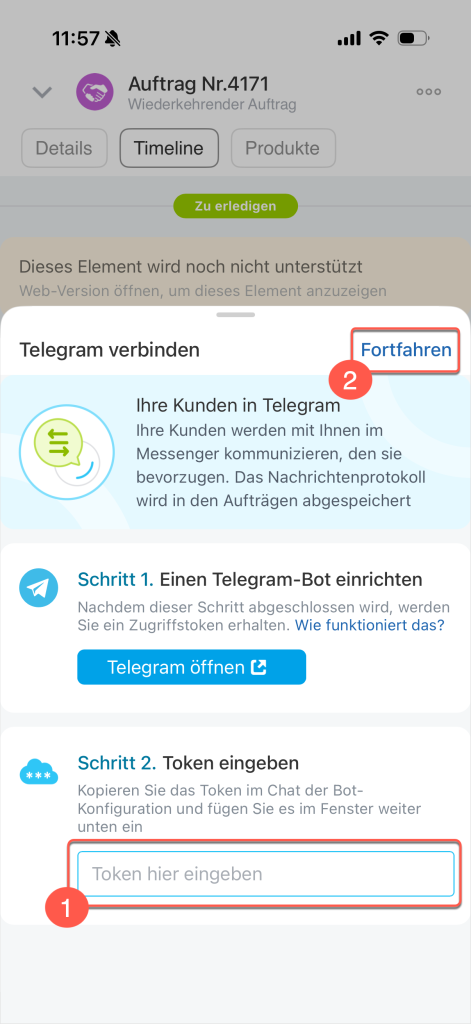 1–2. Fügen Sie den Token in das Feld Schritt 2 ein und klicken Sie auf Fortfahren. Telegram wird mit dem zuletzt erstellten Kommunikationskanal verbunden. Falls gewünscht, können Sie den Kommunikationskanal später in Bitrix24 am Computer anpassen.