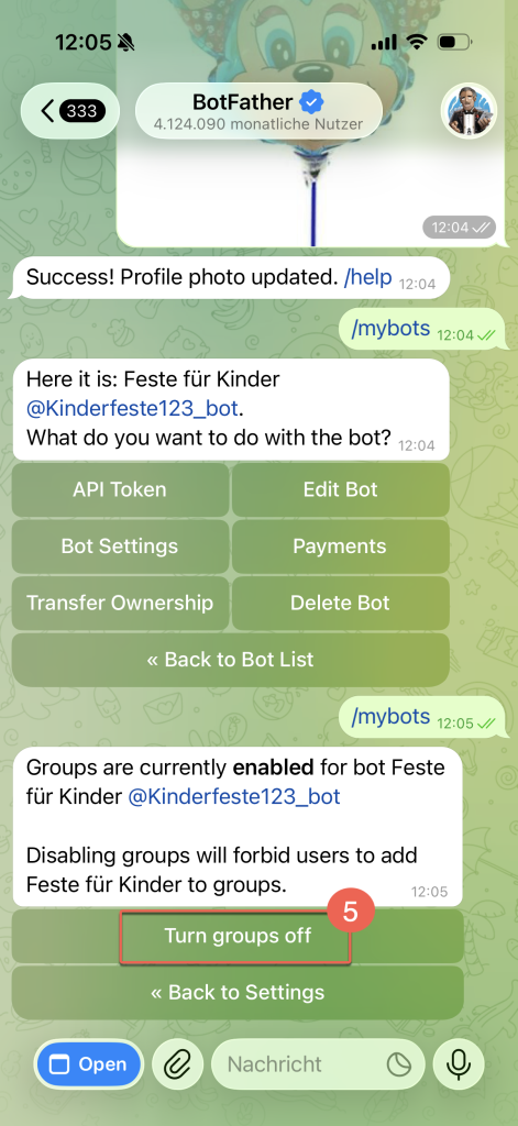 5. Klicken Sie auf Turn groups off. Nun kann der Bot nicht mehr zu Gruppen hinzugefügt werden.