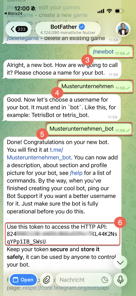 5. Geben Sie einen eindeutigen Namen ein, unter dem der Bot in Telegram gefunden werden kann. Der Name muss mit bot enden, z. B. musterunternehmen_bot.