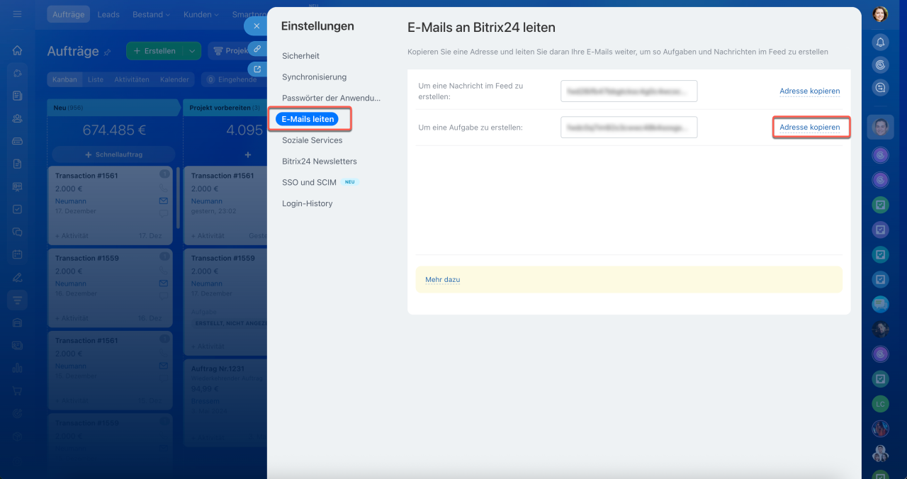 Im Bereich E-Mails leiten kopieren Sie die Adresse im Feld Um eine Aufgabe zu erstellen und teilen Sie diese mit einem externen Nutzer so, wie es Ihnen bequem ist.
