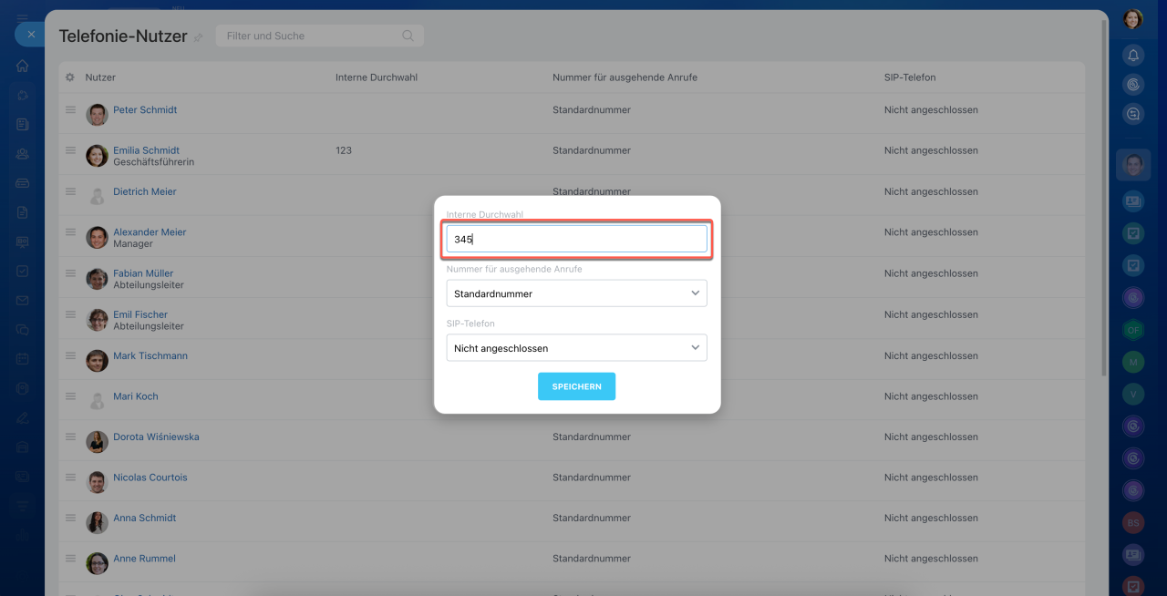 Geben Sie die Nummer im Bereich "Interne Durchwahl" an. Die Durchwahl darf aus maximal 4 Ziffern bestehen. Die Nummer muss einzigartig für jeden Mitarbeiter sein.Durchwahl für Mitarbeiter angeben Die Durchwahl kann man auch im Nutzerprofil des Mitarbeiters angeben und ändern.