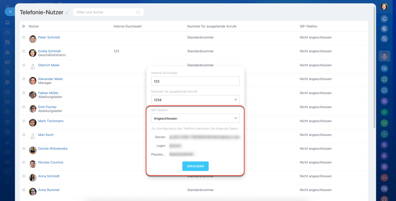Wenn der Mitarbeiter für die Anrufe SIP-Telefone nutzt, wählen Sie für das SIP-Telefon die Option Angeschlossen aus und nutzen Sie die vorhandenen Einstellungen. Das Passwort kann geändert werden.Beispiele für Einstellungen der SIP-Telefone