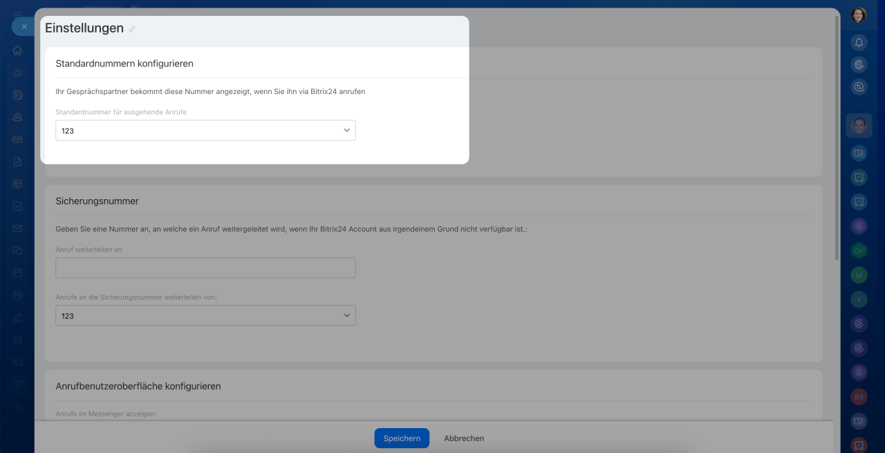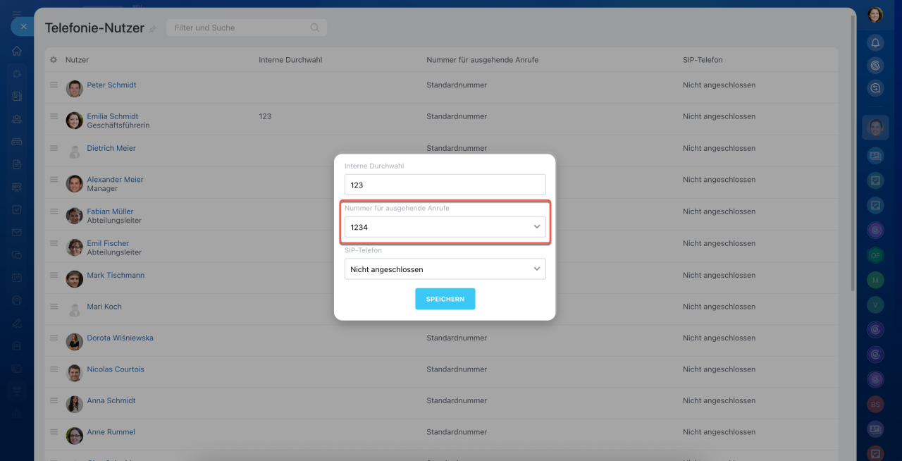 Wenn Sie die Einstellungen nicht bearbeitet haben, wird die "Standardnummer" für alle Mitarbeiter automatisch ausgewählt. Das ist die Nummer, die in den Telefonie-Einstellungen angegeben wurde.Telefonie-Einstellungen Wählen Sie die Nummer für ausgehende Anrufe aus. Wenn nur eine Nummer verbunden ist, werden keine Einstellungen benötigt.