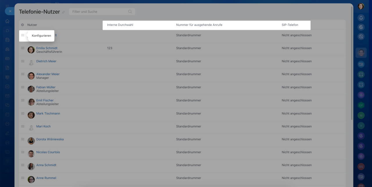 In der Telefonie können Sie Durchwahlen einstellen, Festnetztelefon oder Softphone verbinden und auch eine Nummer für ausgehende Anrufe auswählen. In diesem Beitrag erzählen wir Ihnen, wie Sie diese Optionen für die Mitarbeiter, die mit der Telefonie arbeiten, einschalten können.
