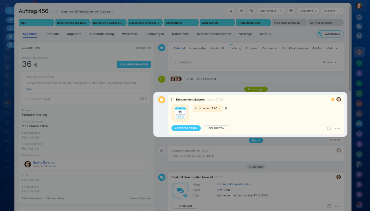 Nehmen wir als Beispiel, dass sich Ihr Unternehmen mit den Technik-Reparaturen befasst. Der Kunde hat sein Handy zur Diagnose und Reparatur gebracht. Wenn Sie in der Ansicht Kanban oder Liste arbeiten, erstellen Sie zuerst einen Lead und nur dann fügen eine Aktivität mit der Erinnerung hinzu, den Kunden anzurufen. In der Ansicht Aktivitäten können Sie es mit einem Klick tun. Erstellen Sie den Auftrag in der Phase Für heute und CRM fügt automatisch die Aktivität mit der entsprechenden Frist - bis zum Ende des Arbeitstages hinzu.