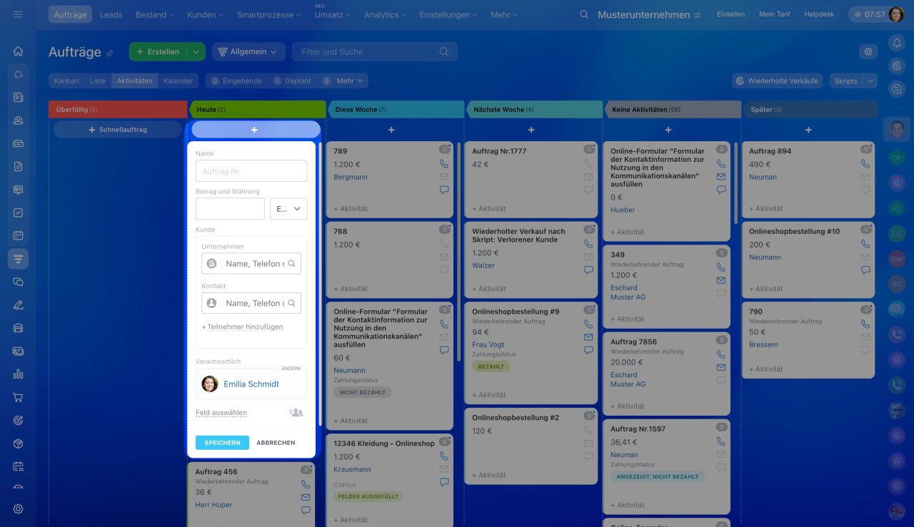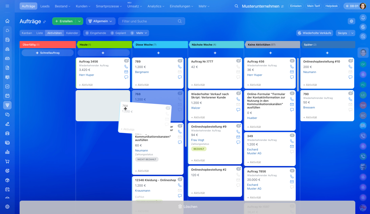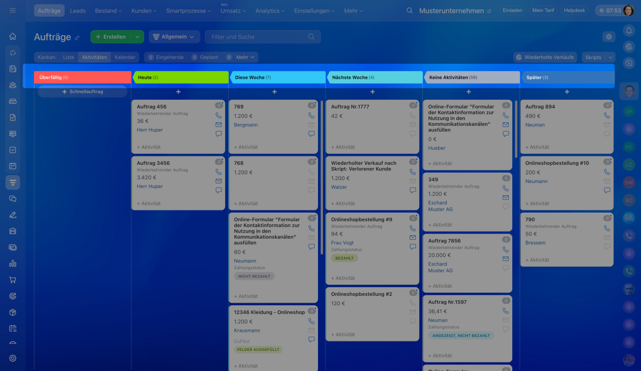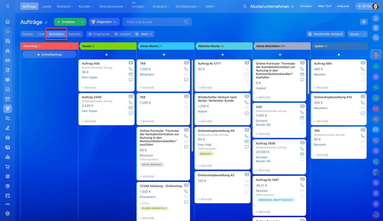 Im CRM ist der Modus Aktivitäten verfügbar. In dieser Ansicht befinden sich Aufträge und Leads in einer der Spalten abhängig von der Frist der Aktivität innerhalb des Elementes.