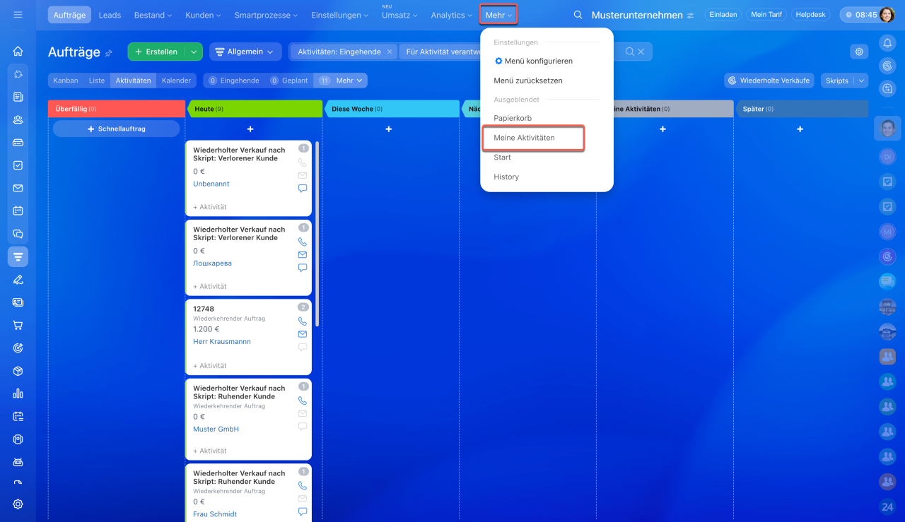 Die Liste von geplanten und ausgeführten Aktivitäten finden Sie im Bereich CRM > Aktivitäten. Hier werden die Aktivitäten aus allen CRM-Elementen angezeigt.
