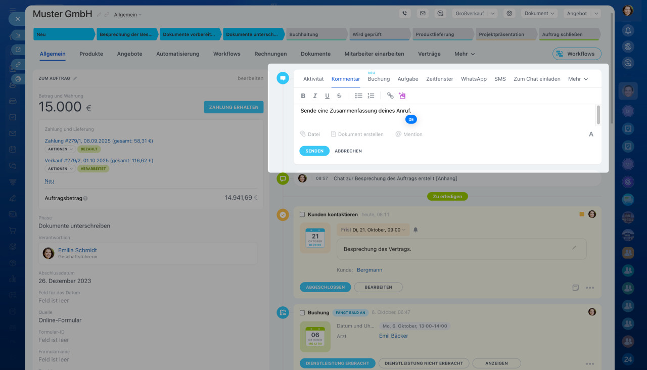 - In der Timeline des CRM-Elements können Sie Aktivitäten planen, Kommentare und Hinweise hinterlassen, und Details des Auftrags mit Kollegen besprechen.