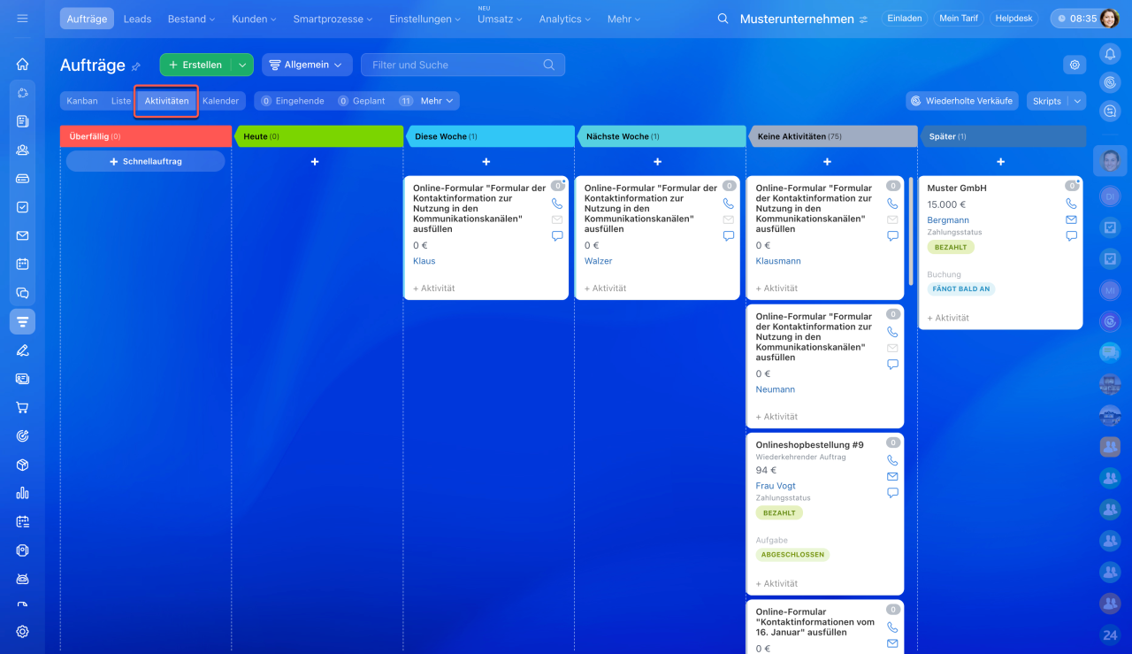 Die Aktivitäten können nach Typ, Frist und anderen Parametern gefiltert werden.
