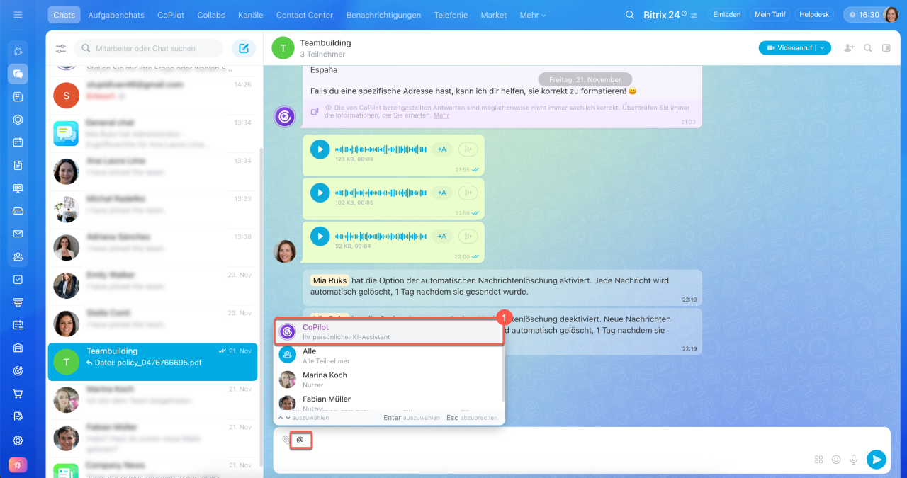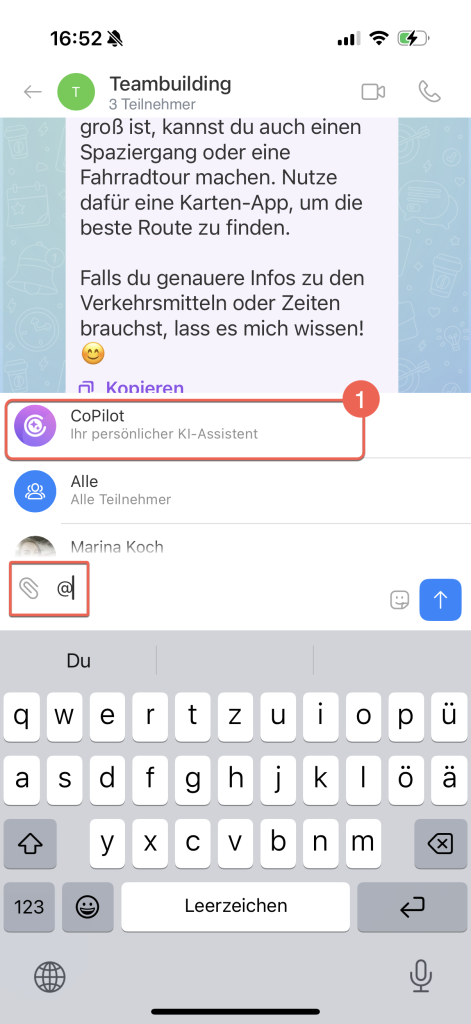Um einem Kollegen im Chat mit CoPilot zu schreiben, erwähnen Sie den Nutzer. Klicken Sie auf + oder @ und geben Sie den Namen ein. Auf alle Nachrichten ohne Erwähnung wird CoPilot in diesem Chat antworten.