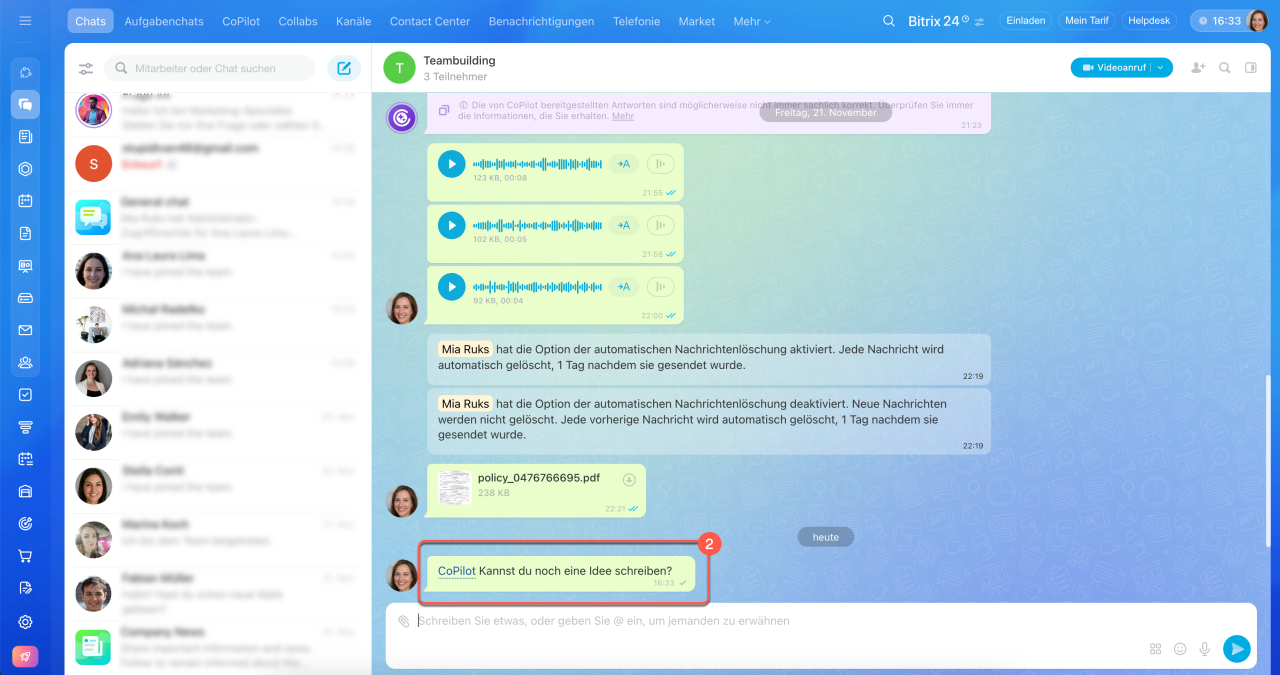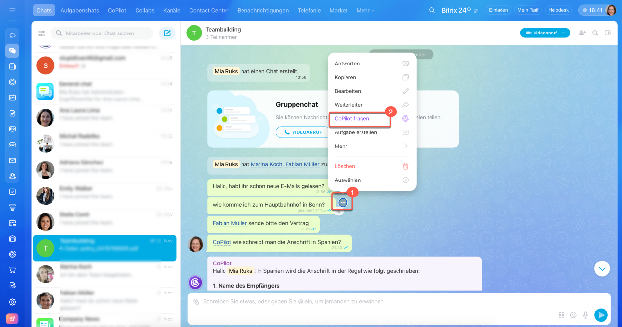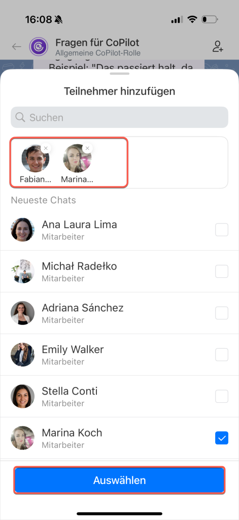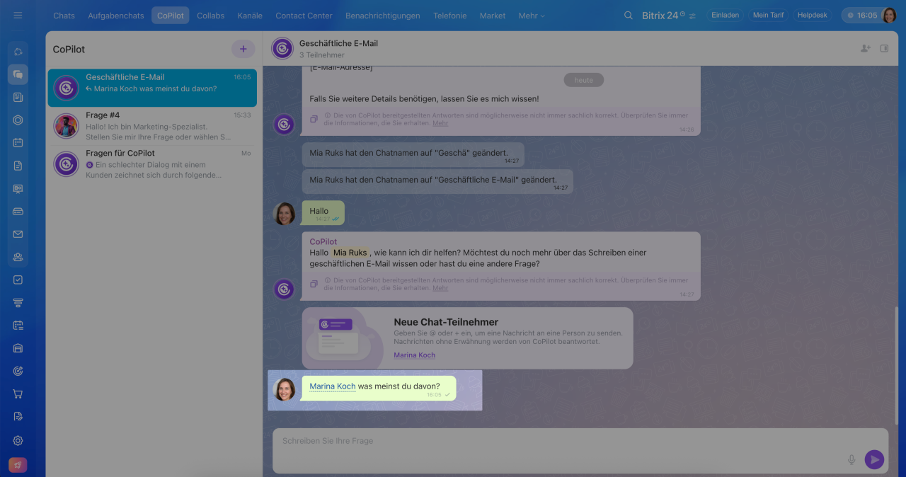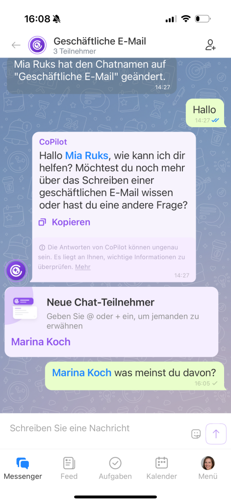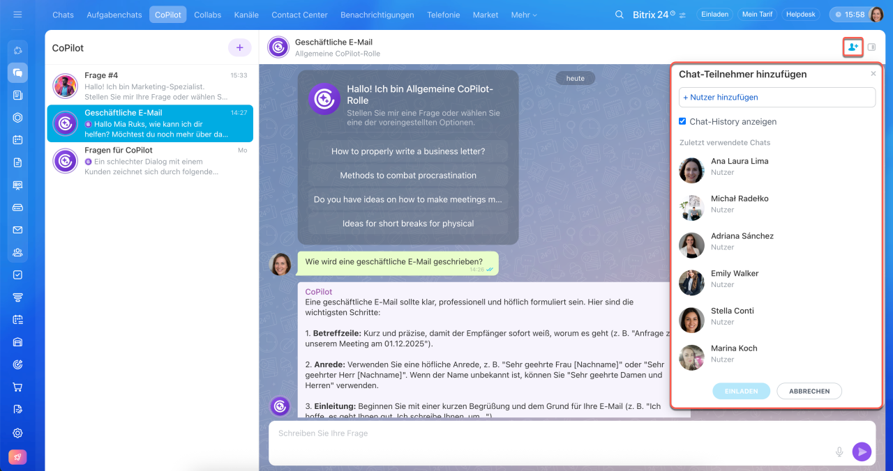 Die neuen Teilnehmer können jederzeit zum Chat hinzugefügt werden — beim Erstellen des Chats oder während der Kommunikation mit CoPilot.