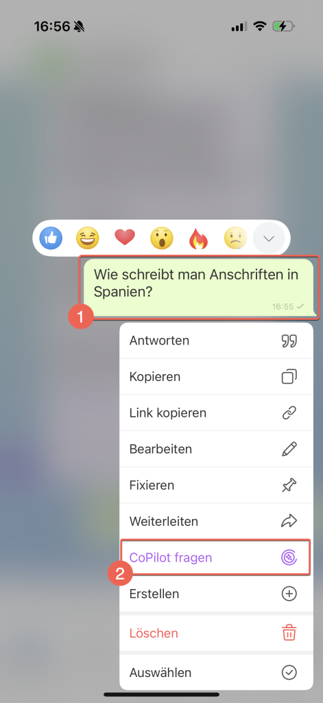 Um CoPilot etwas zu fragen, können Sie eine neue Nachricht schreiben oder das Kontextmenü in einer bereits gesendeten Nachricht verwenden.