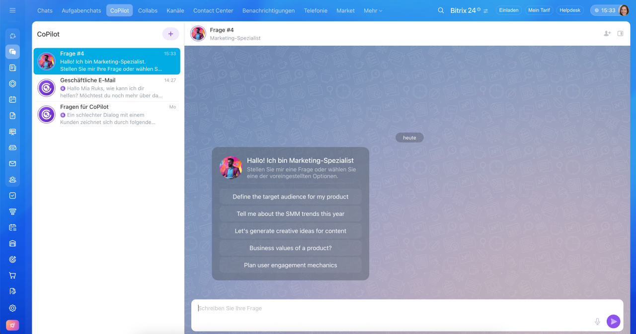 - In Bitrix24 können Sie mit CoPilot im speziellen Chat kommunizieren. CoPilot unterstützt Sie bei der Lösung verschiedener Aufgaben, sei es das Verfassen von Marketingtexten oder die Ausarbeitung außergewöhnlicher Geschäftsideen.