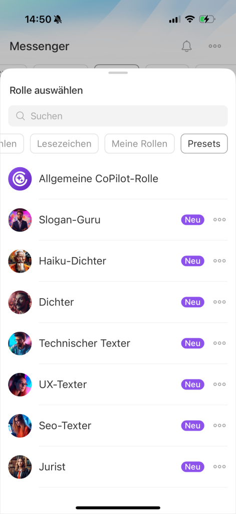 Die Auswahl der Rolle ist sowohl zu Beginn der Erstellung eines neuen Chats als auch während der Kommunikation mit CoPilot möglich. Dabei können verschiedene Rollen ausgewählt werden, die jeweils in Kategorien nach Tätigkeitsbereichen sortiert sind.