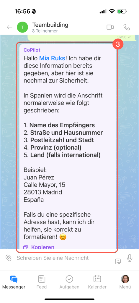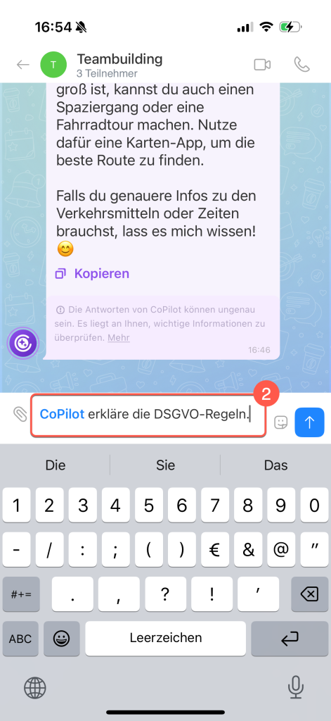 - Im Texteingabefeld erscheint die zitierte Nachricht und die Erwähnung von CoPilot. Ergänzen Sie Ihre Frage – der KI-Assistent wird direkt im Chat antworten.