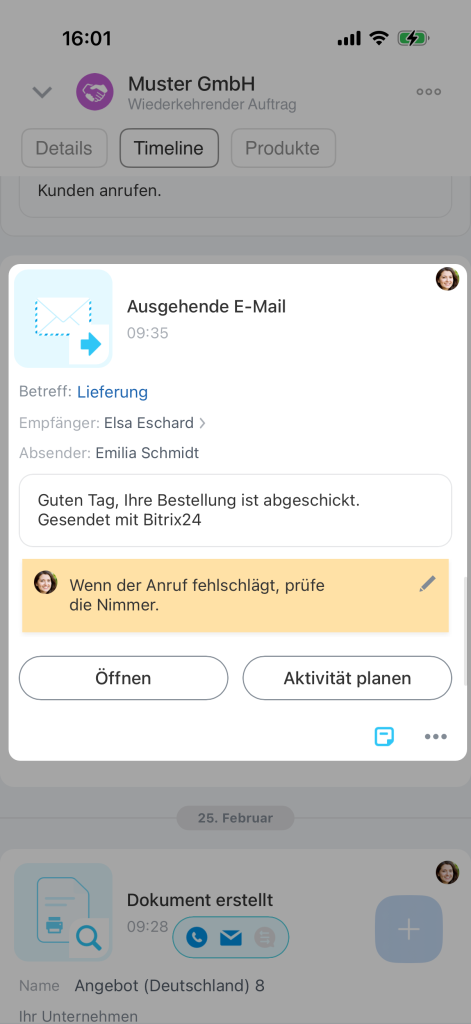In Bitrix24 ist jetzt die Vorschau von E-Mails in der Timeline des CRM-Elementes verfügbar. Sie können schnell einen Überblick über den Inhalt der E-Mail erhalten, ohne sie öffnen zu müssen. Die Vorschau funktioniert in jedem CRM-Element mit der Timeline: in Aufträgen, Leads, Kontakten, Unternehmen, Rechnungen und Angeboten.