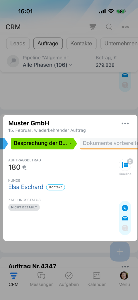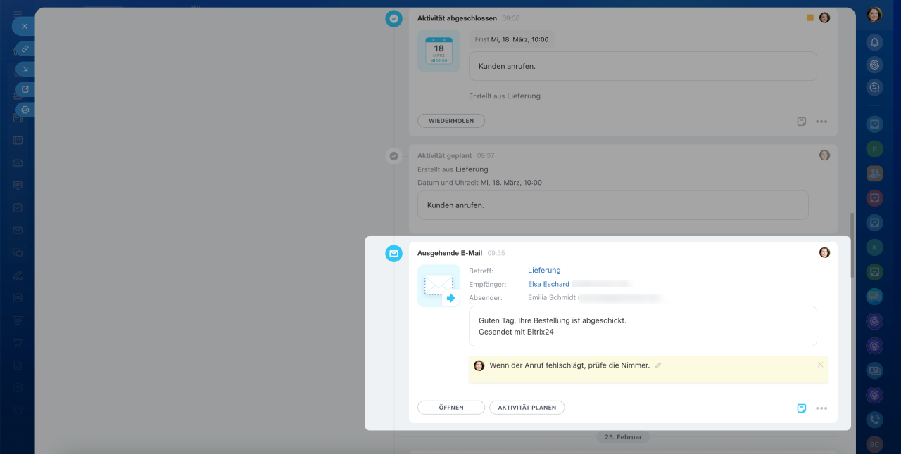 Öffnen Sie den Bereich CRM > Aufträge. Wählen Sie einen Auftrag aus, in dem Sie eine E-Mail lesen möchten.
