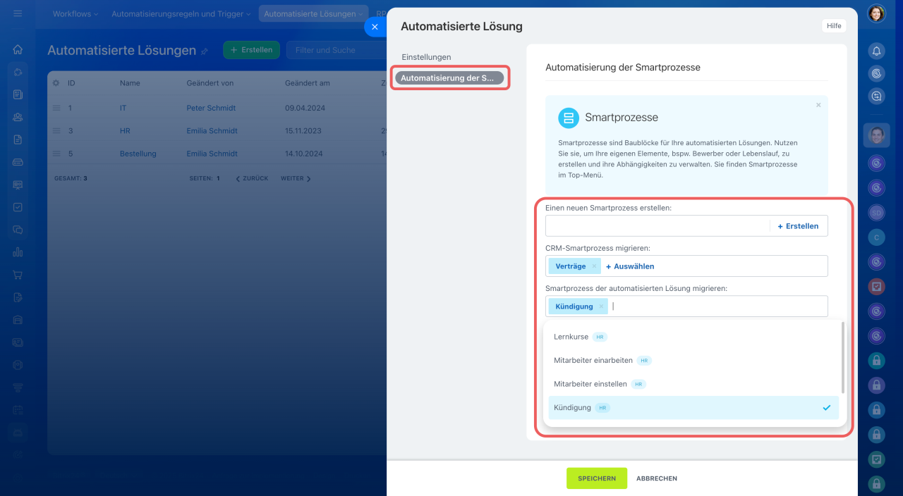 Smartprozess mit der automatisierten Lösung verbinden. Öffnen Sie den Bereich Smartprozess in den Einstellungen der automatisierten Lösung. Erstellen Sie einen neuen Smartprozess oder verschieben Sie ihn aus dem CRM oder einer anderen automatisierten Lösung.