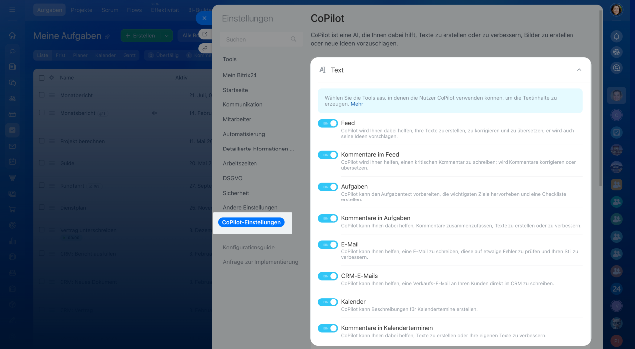 In welchen Bitrix24 Bereichen ist CoPilot verfügbar?