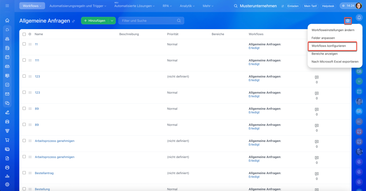 Klicken Sie auf Einstellungen (⚙️) > Workflows konfigurieren. Danach öffnen Sie die gewünschte Vorlage aus.
