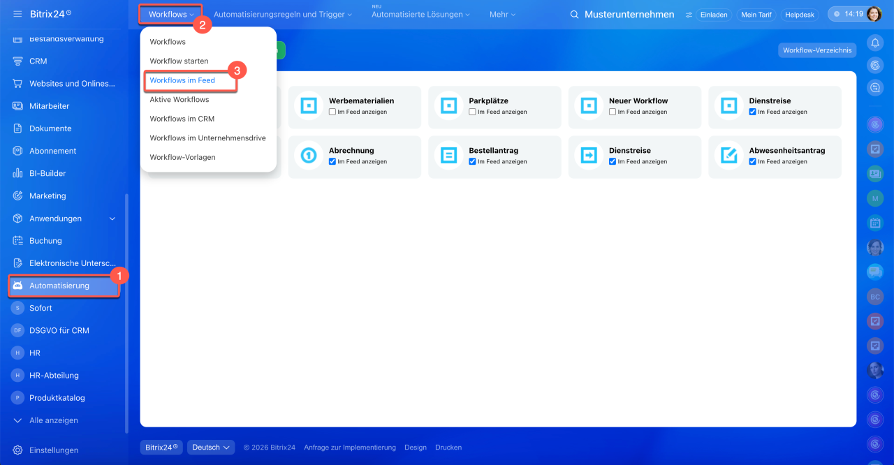Im Unternehmen sehen wir, dass der Workflow 2 Stunden dauert. Um den ihn zu bearbeiten, öffnen Sie den Bereich Automatisierung > Workflows > Workflows im Feed und wählen Sie den zu bearbeitenden Workflow aus.