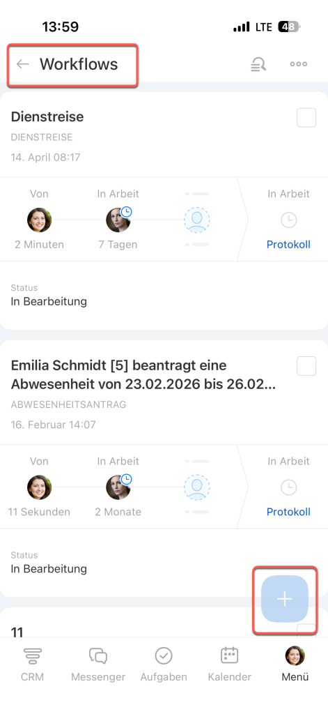 Öffnen Sie in der mobilen Anwendung den Tab Workflows und klicken Sie auf + .