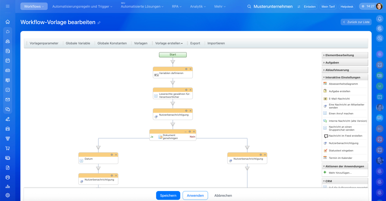 Mit der mobilen Bitrix24 Anwendung können Sie jetzt Workflows einfach starten und verwalten. Wir haben zusätzlich ein Tool eingeführt, mit dem Sie ermitteln können, wie viel Zeit das Unternehmen für die Genehmigung eines Workflows aufwendet.