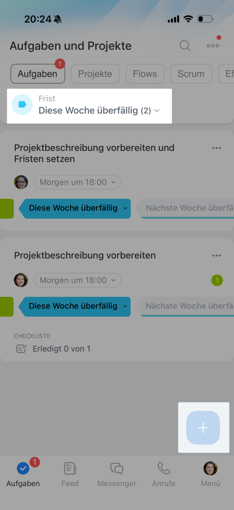 Öffnen Sie eine der Phasen, um die Aufgaben anzuzeigen, die eine bestimmte Frist haben. In der Phase Heute befinden sich die Aufgaben, die bis zum Ende des laufenden Arbeitstages ausgeführt werden müssen.