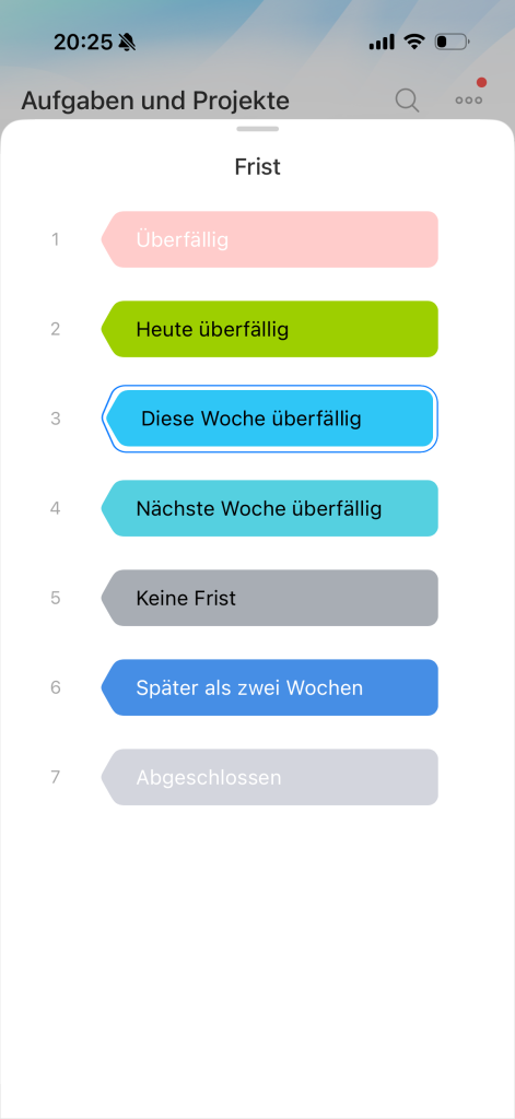 Die Ansicht Fristen setzt Ihre Pünktlichkeit beim Erledigen der Aufgaben in den Mittelpunkt. In diesem Modus werden Aufgaben automatisch nach ihren Fristen in verschiedenen Spalten angeordnet.