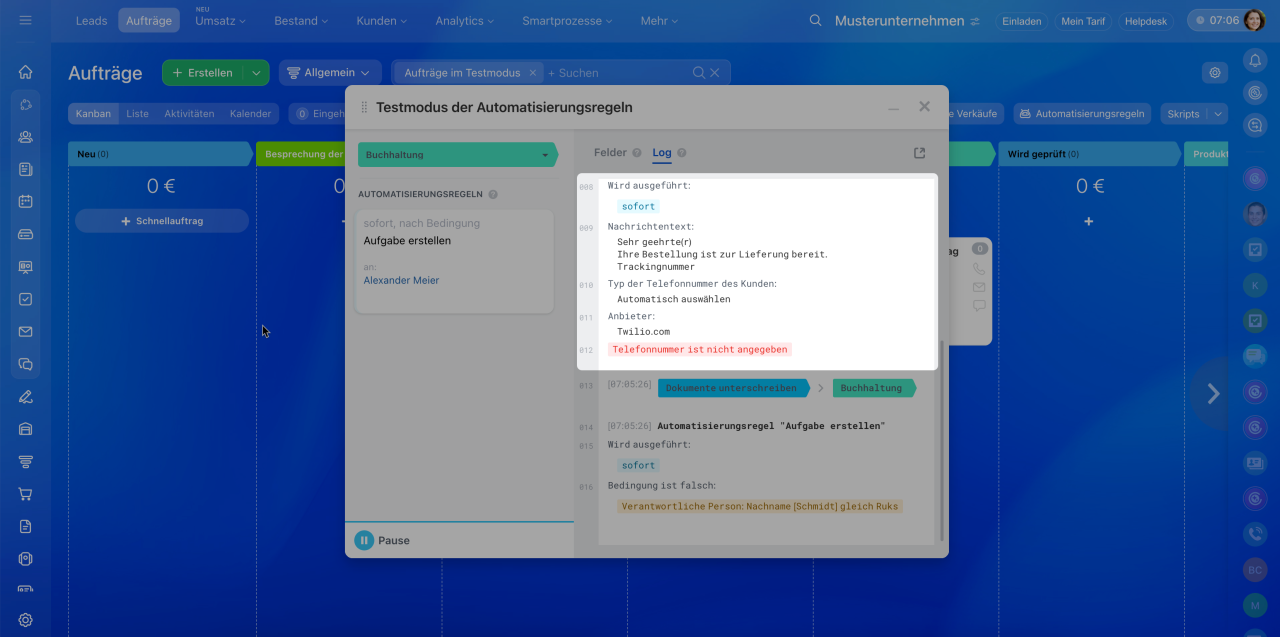 Die Automatisierungsregel "E-Mail an den Kunden senden" wurde nicht ausgeführt, denn die E-Mail-Adresse des Kunden ist nicht angegeben. Im Log wurde der Fehler protokolliert.
