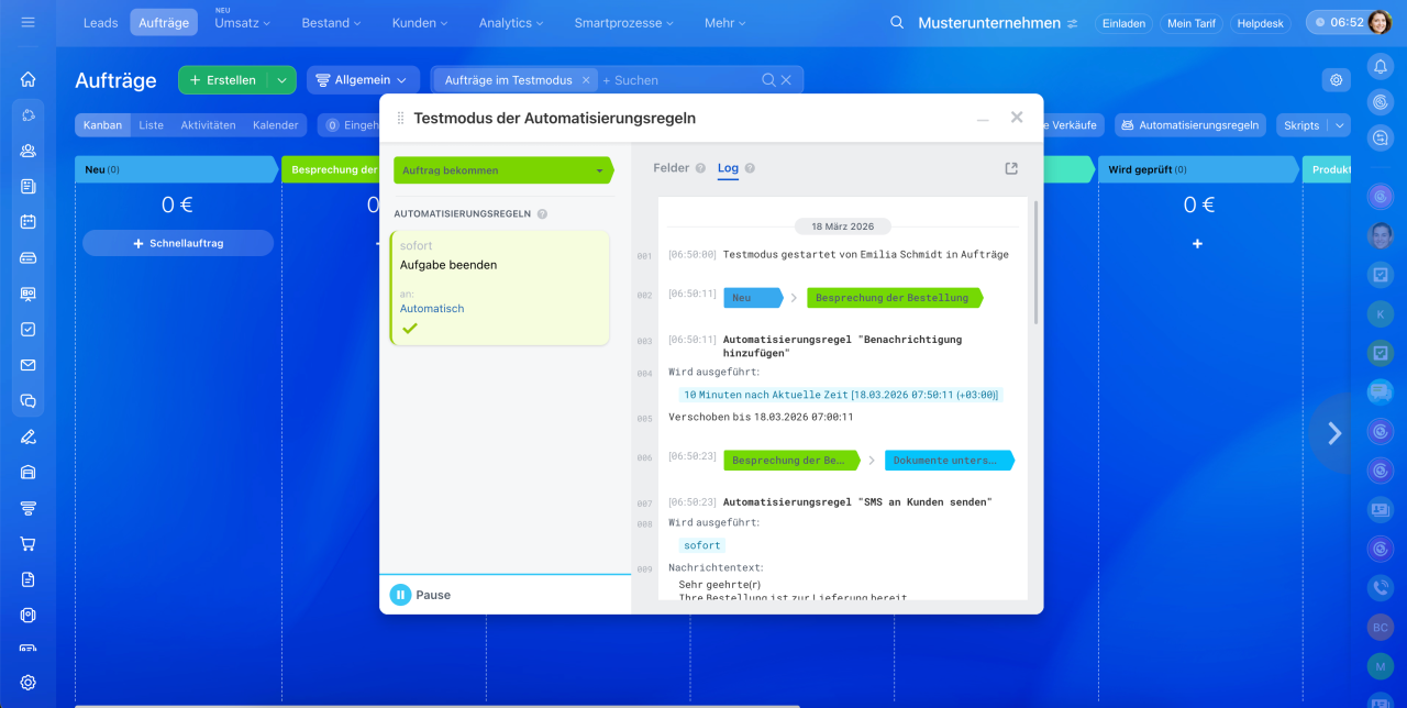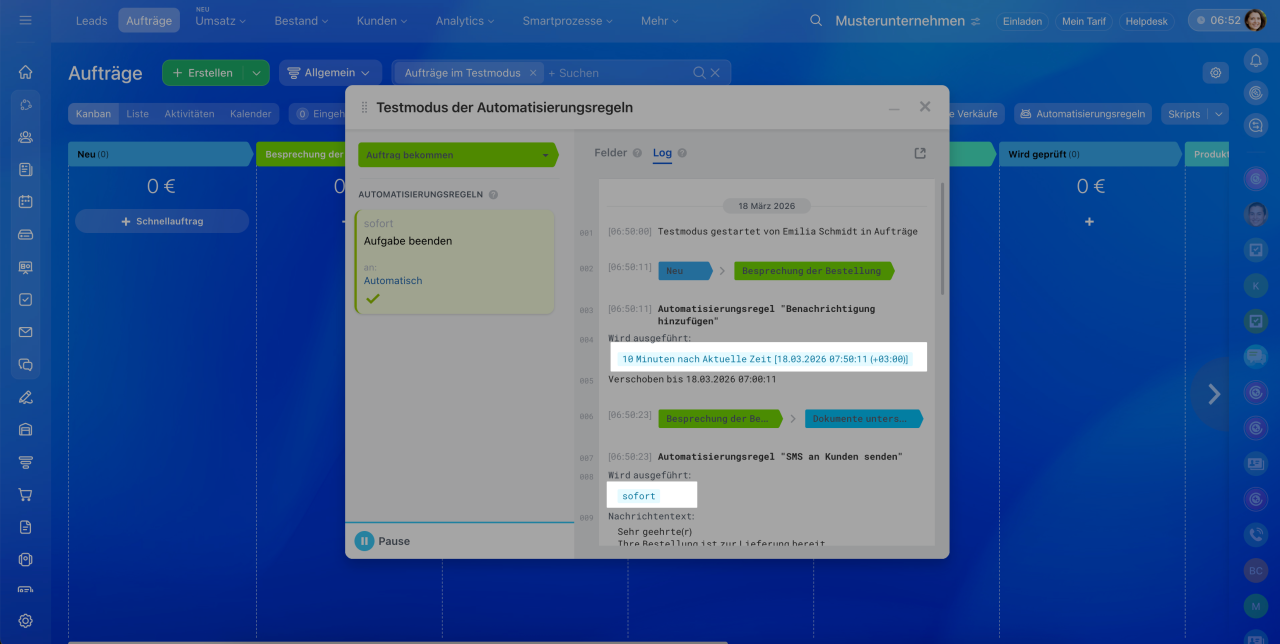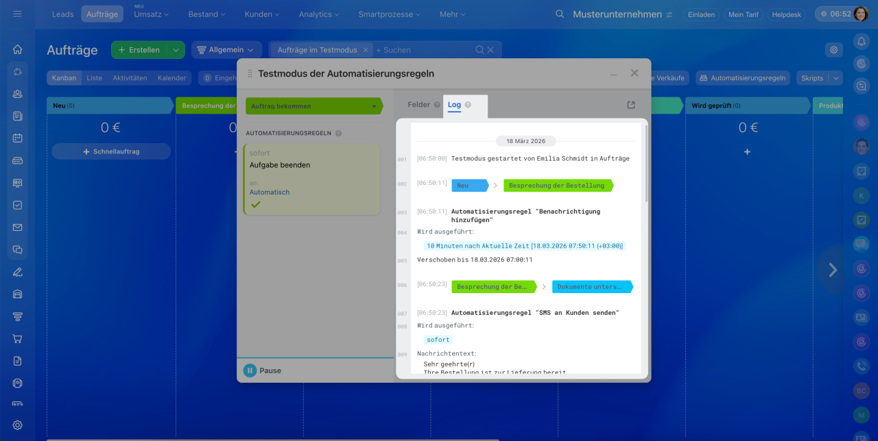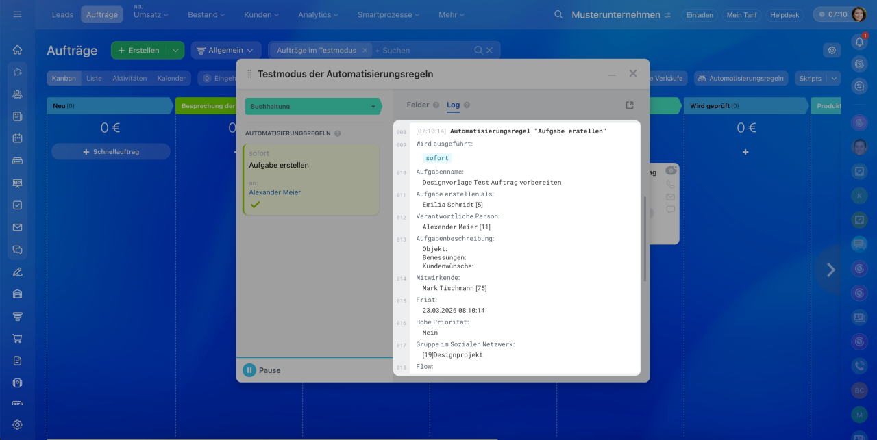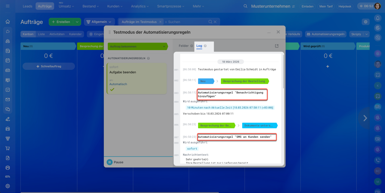 Alle Aktionen der Automatisierungsregeln und Fehler werden ins Log geschrieben, das im Testmodus-Fenster protokolliert wird.