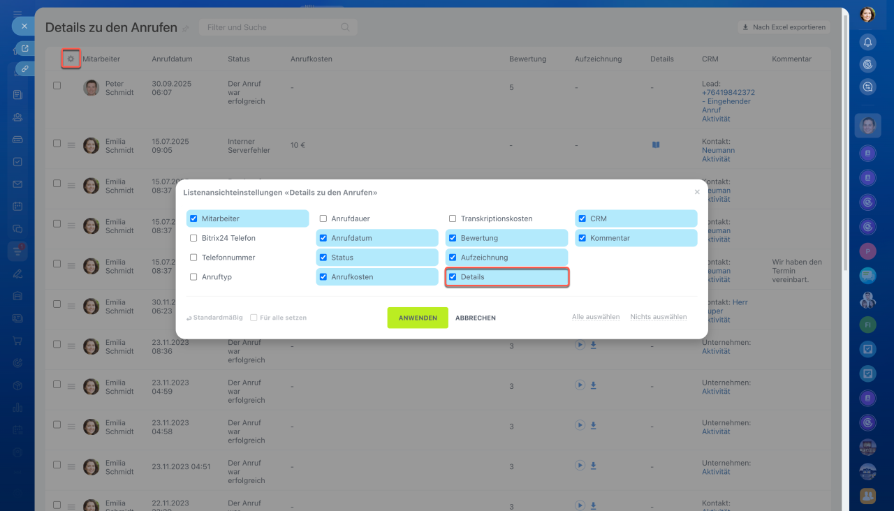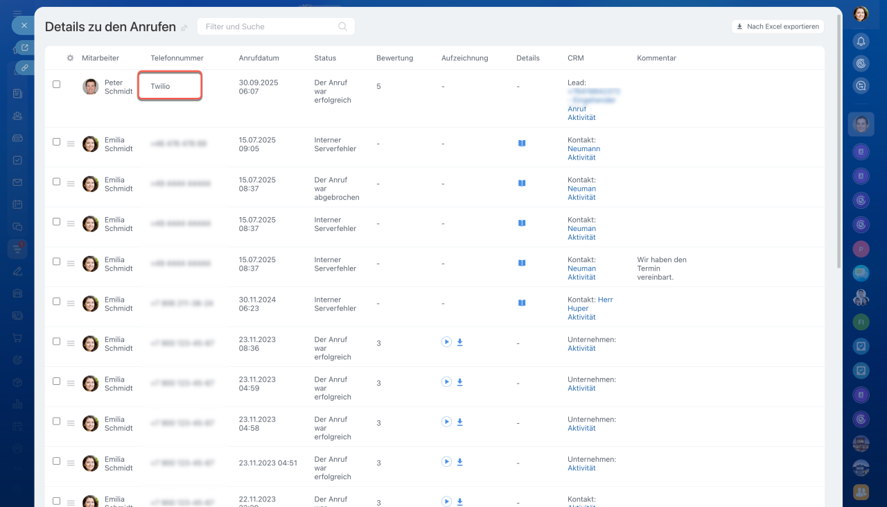 Prüfen Sie die Spalte Telefonnummer in Bitrix24 für den Anruf mit einem Fehler. Wenn eine App dort angegeben ist, wenden Sie sich an den technischen Support der jeweiligen App, um Hilfe zu erhalten.
