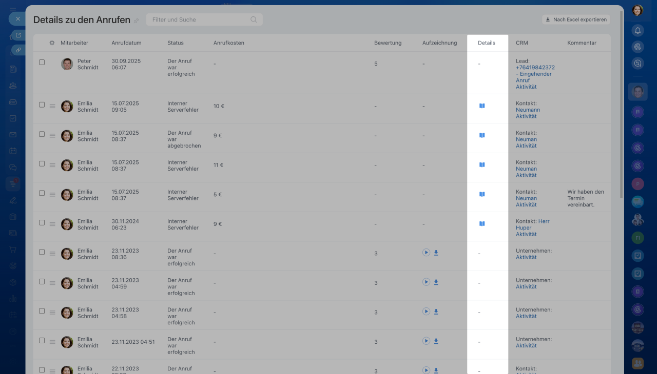 Gehen Sie auf Telefonie > Anrufdetails. Finden Sie die Spalte Details. Das Anruf-Log wird mit dem Doppelklick geöffnet.