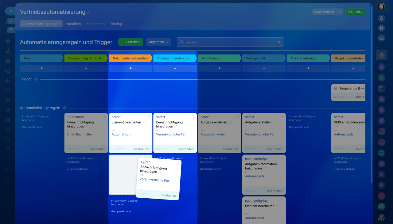 - Um die Phase zu ändern, halten Sie den Block gedrückt und verschieben Sie ihn in die andere Spalte. Um die Automatisierungsregel zu kopieren, klicken Sie darauf auf Aktionen > Kopieren.