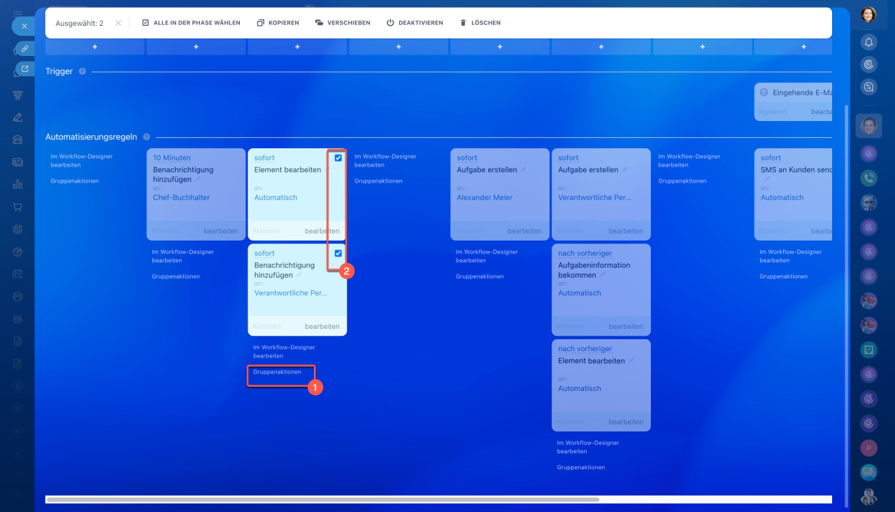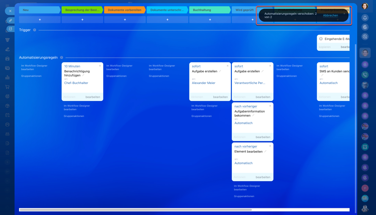 - Im CRM können Sie die Automatisierungsregeln zwischen Phasen, Pipelines und CRM-Elementen übertragen oder kopieren.