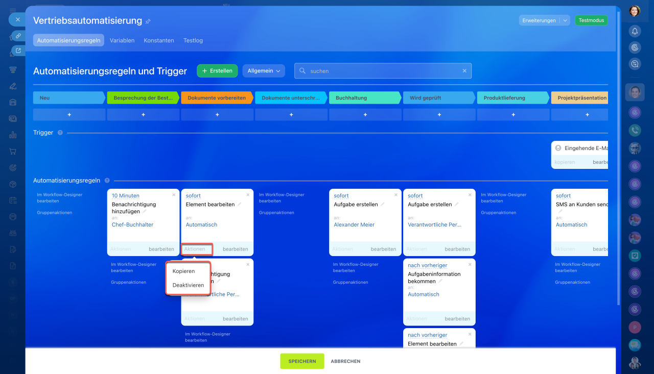 Um die Automatisierungsregel zu kopieren, klicken Sie im Block auf Aktionen > Kopieren. Die neue Regel erscheint in derselben Phase.