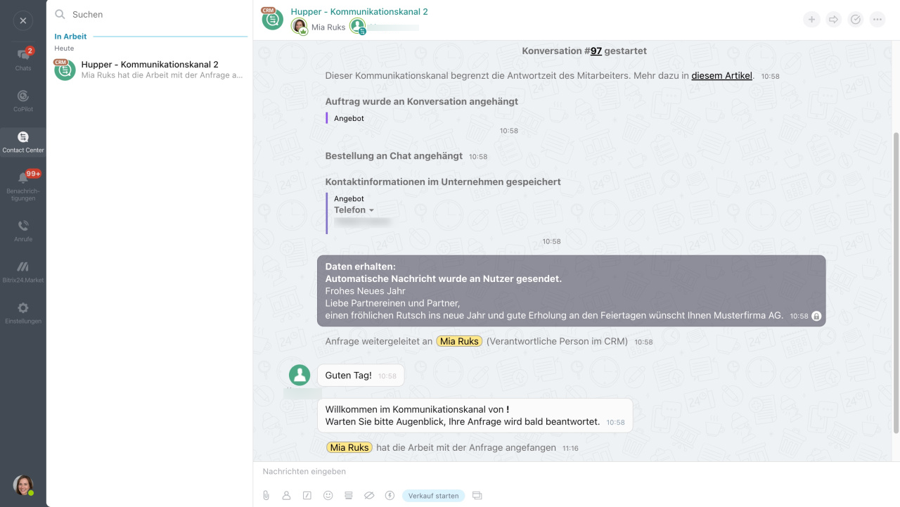 Der Kunde bekommt die Nachricht in WhatsApp zugestellt. Wenn eine Antwort folgt, wird ein Chat in den Kommunikationskanälen erstellt. Der Kundenname, Telefonnummer und der Chatverlauf werden im Formular des CRM-Elements gespeichert.