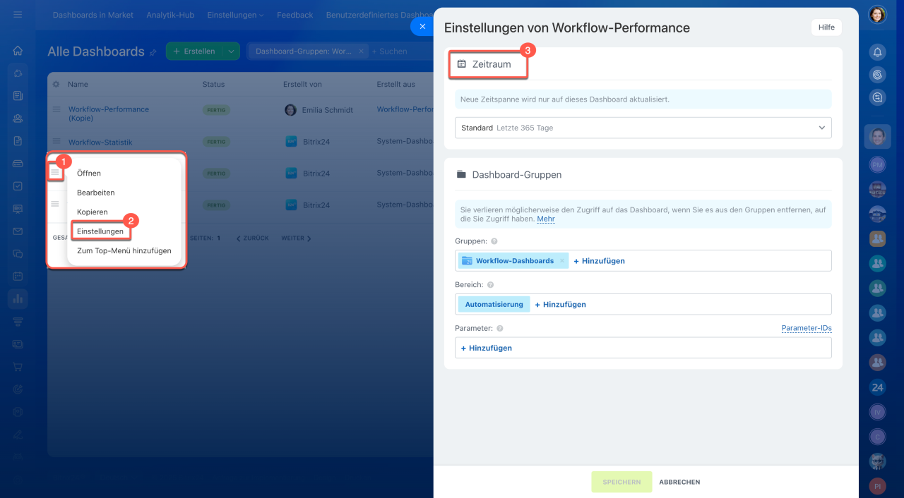 Für jeden Bericht kann seine eigene Zeitperiode eingestellt werden. Wählen Sie das Dashboard aus der Liste aus, öffnen Sie das Menü (≡) und klicken Sie auf Einstellungen. Im geöffneten Bereich stellen Sie die Zeitperiode ein.