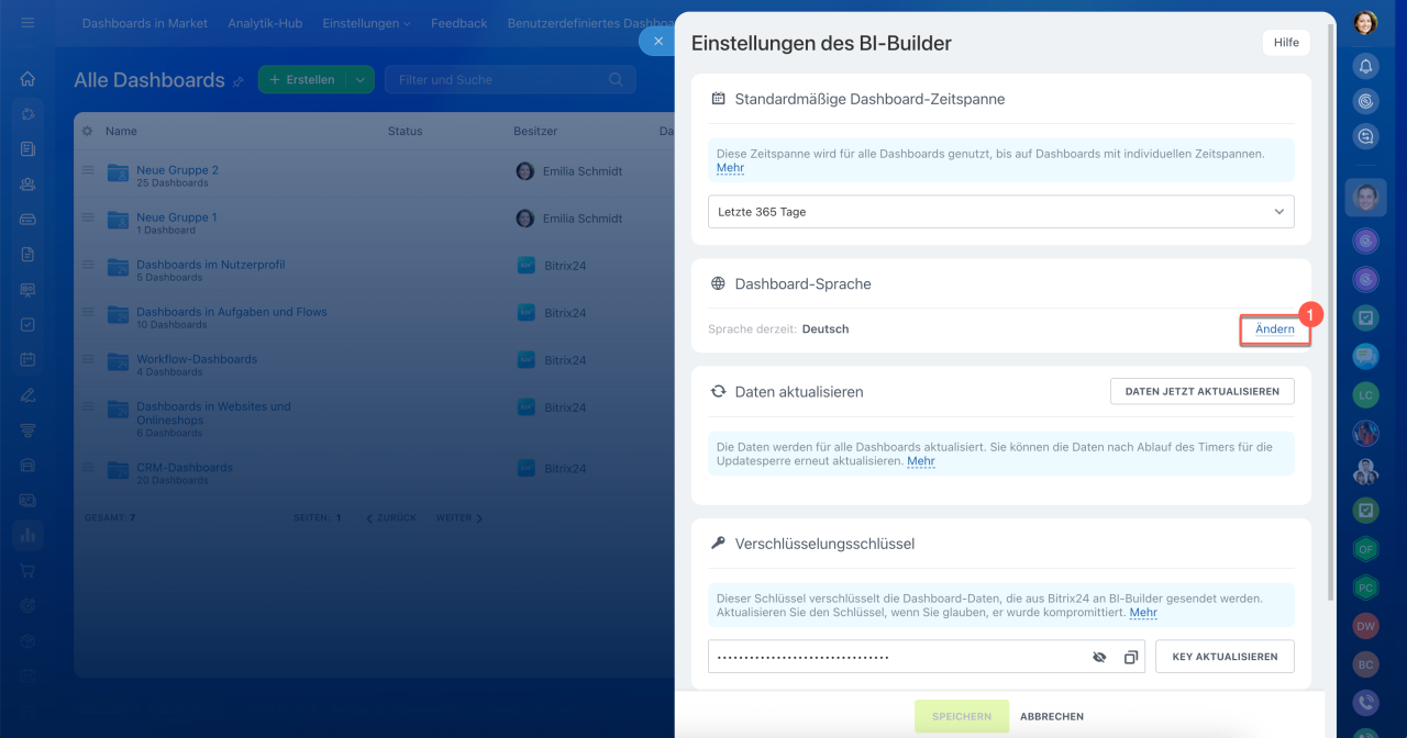 Dashboard-Sprache. In den Einstellungen können Sie die Sprache festlegen, in der Kennzahlen, Diagrammbeschriftungen und Interface-Elemente innerhalb der BI-Dashboards angezeigt werden. Diese Funktion ermöglicht es, die Dashboards an die Sprachpräferenzen Ihres Teams anzupassen, falls Mitarbeiter in verschiedenen Sprachen arbeiten. Um die Sprache zu ändern, klicken Sie auf Ändern, wählen Sie die gewünschte Sprache aus der Liste aus und speichern Sie die Änderungen.