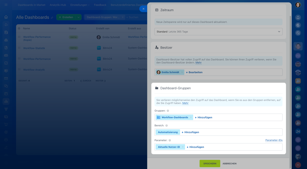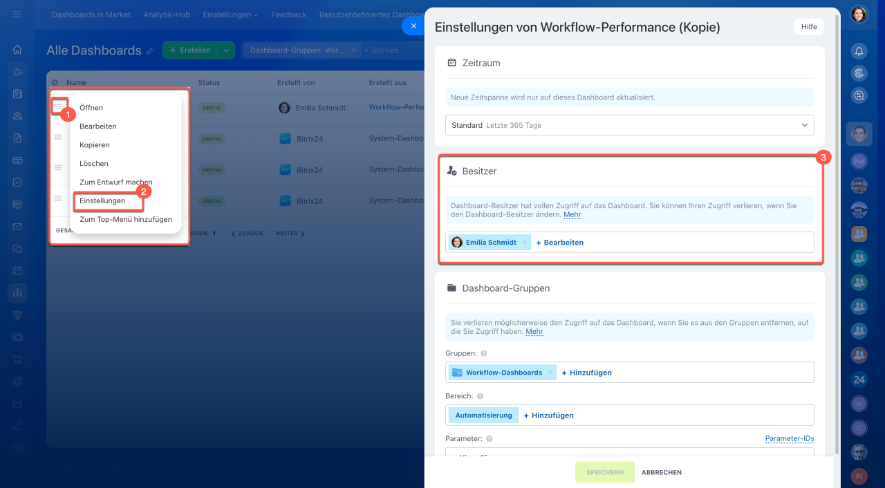 Der Besitzer kann in den Dashboard-Einstellungen geändert werden. Dies kann entweder vom aktuellen Besitzer oder von einem Mitarbeiter mit den entsprechenden Bearbeitungsrechten durchgeführt werden. Wählen Sie den gewünschten Bericht aus der Liste aus, öffnen Sie die Einstellungen und geben Sie einen neuen Besitzer an.
