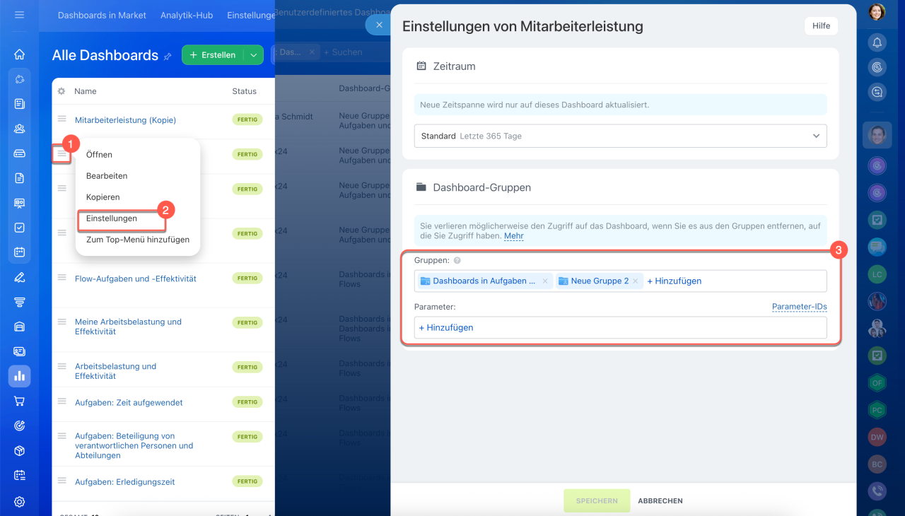 Dashboard-Gruppen. Öffnen Sie die Einstellungen des Dashboards, um die Parameter festzulegen und auszuwählen, in welchen Bitrix24-Bereichen das Dashboard angezeigt werden soll. Dashboard-Gruppen sind thematische Sammlungen von Dashboards. Bitrix24 bietet vorgefertigte Gruppen an – etwa für Dashboards aus dem Marketplace oder für Systemberichte. Jede Gruppe ist einem bestimmten Bereich oder Tool zugeordnet. Parameter sind Variablen, mit denen Sie Daten filtern oder gezielt bestimmte Werte im Dashboard darstellen können. Diese Funktionen helfen Ihnen, Dashboards präzise an Ihre Anforderungen anzupassen.