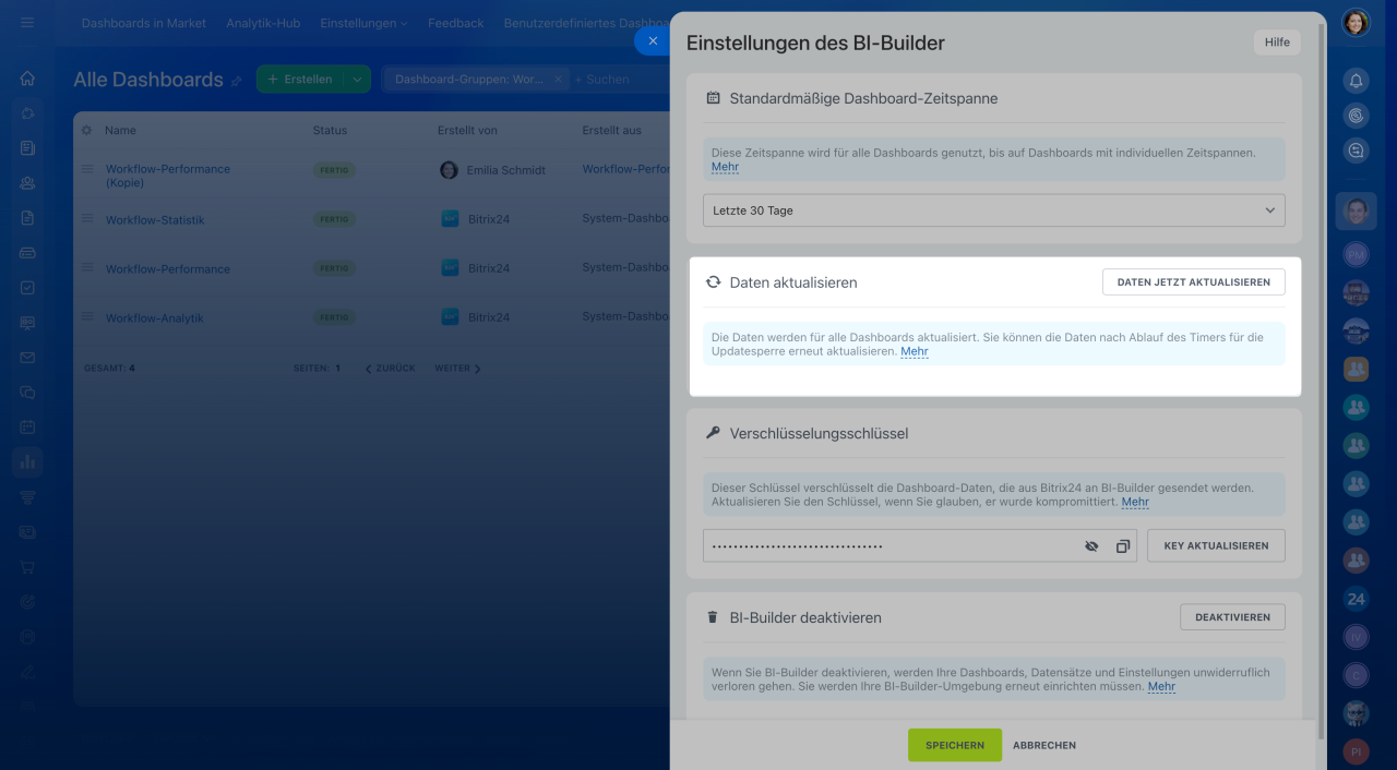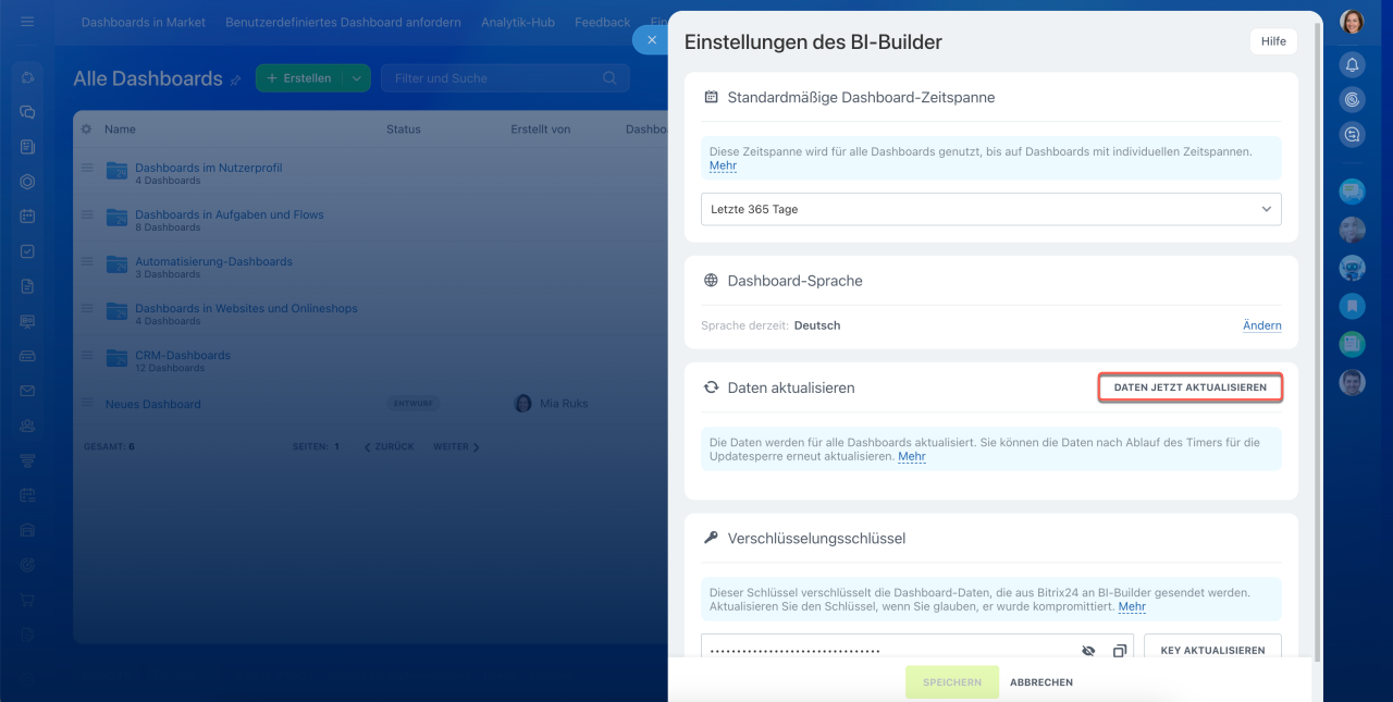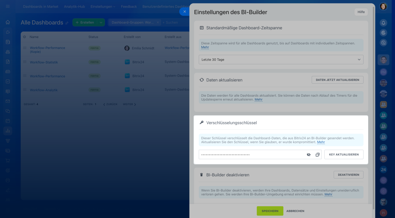 Verschlüsselungsschlüssel. Der Schlüssel ist ein einzigartiger Identifikator, der die Daten aus Bitrix24 mit dem BI-Builder verknüpft. Aktualisieren Sie den Schlüssel, wenn unbefugte Personen darauf Zugriff erhalten haben.