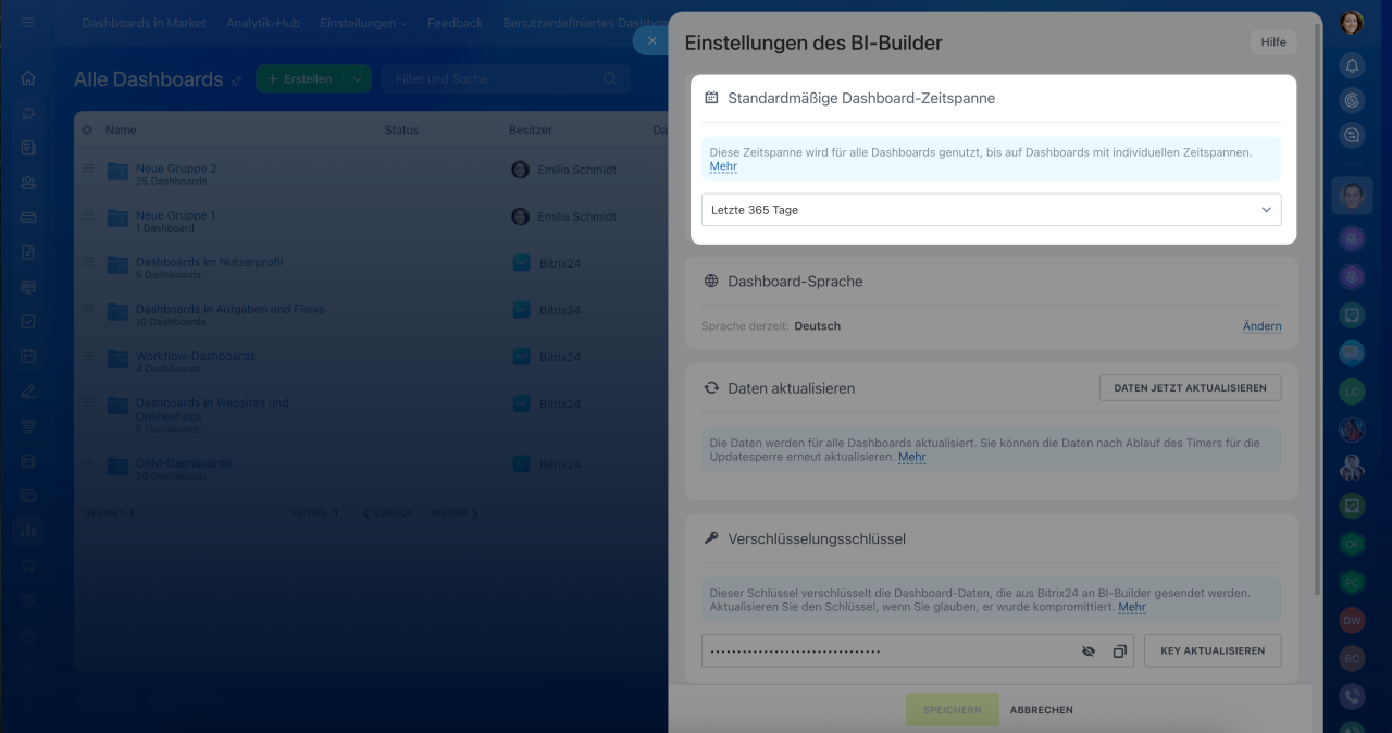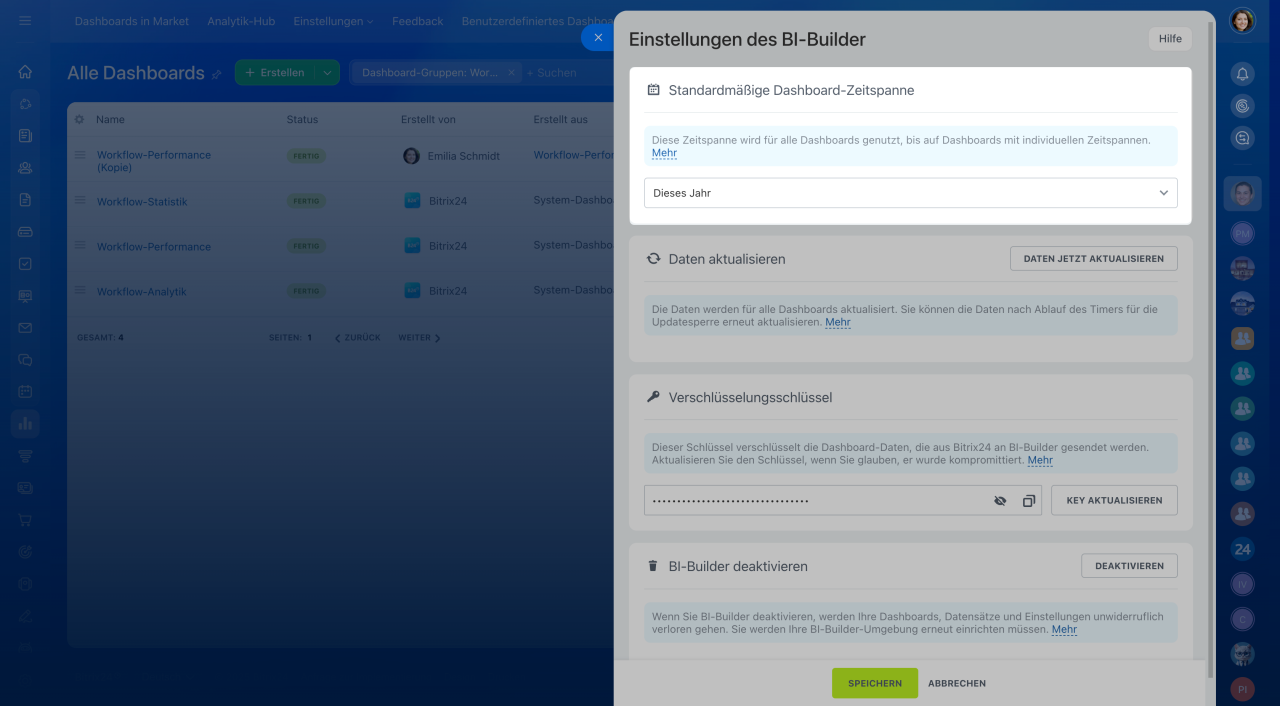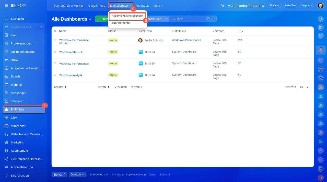 - Um die Einstellungen zu öffnen, gehen Sie auf CRM > BI-Builder > Meine Dashboards > Einstellungen (⚙️).