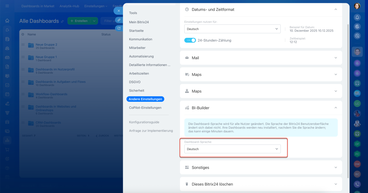 Die Dashboard-Sprache wird für alle Nutzer aktualisiert. Dies betrifft jedoch die anderen Bitrix24-Tools nicht. Nach dem Wechsel werden die Dashboards neu geladen, was einige Minuten in Anspruch nehmen kann.