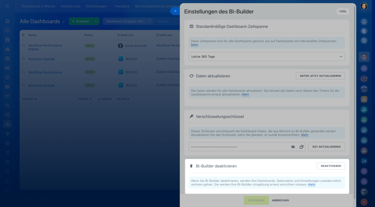 BI-Builder deaktivieren. Wenn Sie Ihren Account auf den Tarif Basic (in einigen Regionen nicht verfügbar) oder Free downgraden, können Sie den BI-Builder manuell deaktivieren. Danach werden alle benutzerdefinierten Dashboards, Datensätze und Einstellungen gelöscht. Diese Information kann nicht wiederhergestellt, sondern nur erneut konfiguriert werden. Eine erneute Aktivierung des BI-Builders ist erst nach 24 Stunden möglich.