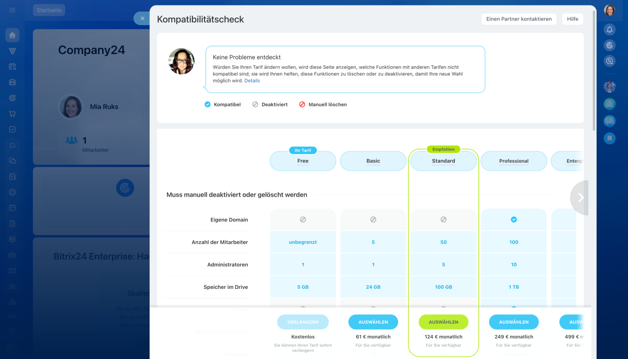 Das Widget Mein Tarif ist aus jedem Bereich Ihres Bitrix24 zugänglich. Hier finden Sie folgende Tools: