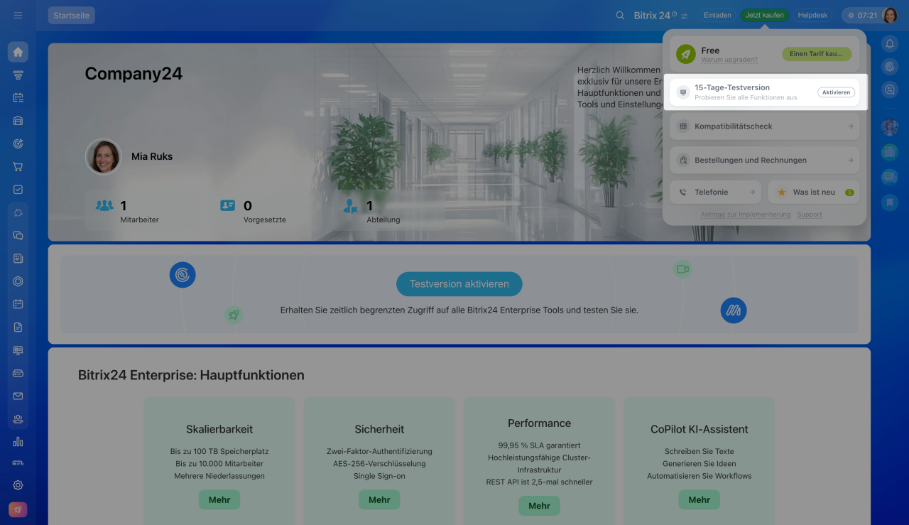 Testversion aktivieren. Aktivieren Sie die kostenlose Testversion, um Bitrix24-Tools auszuprobieren und einen passenden Tarif zu wählen. Nach dem Einschalten wird der Button rot. Die Überschrift ändert sich auf Testversion.