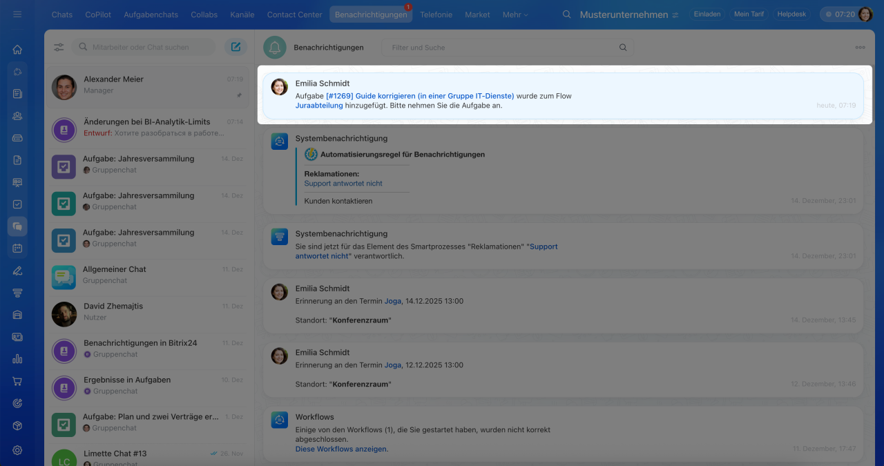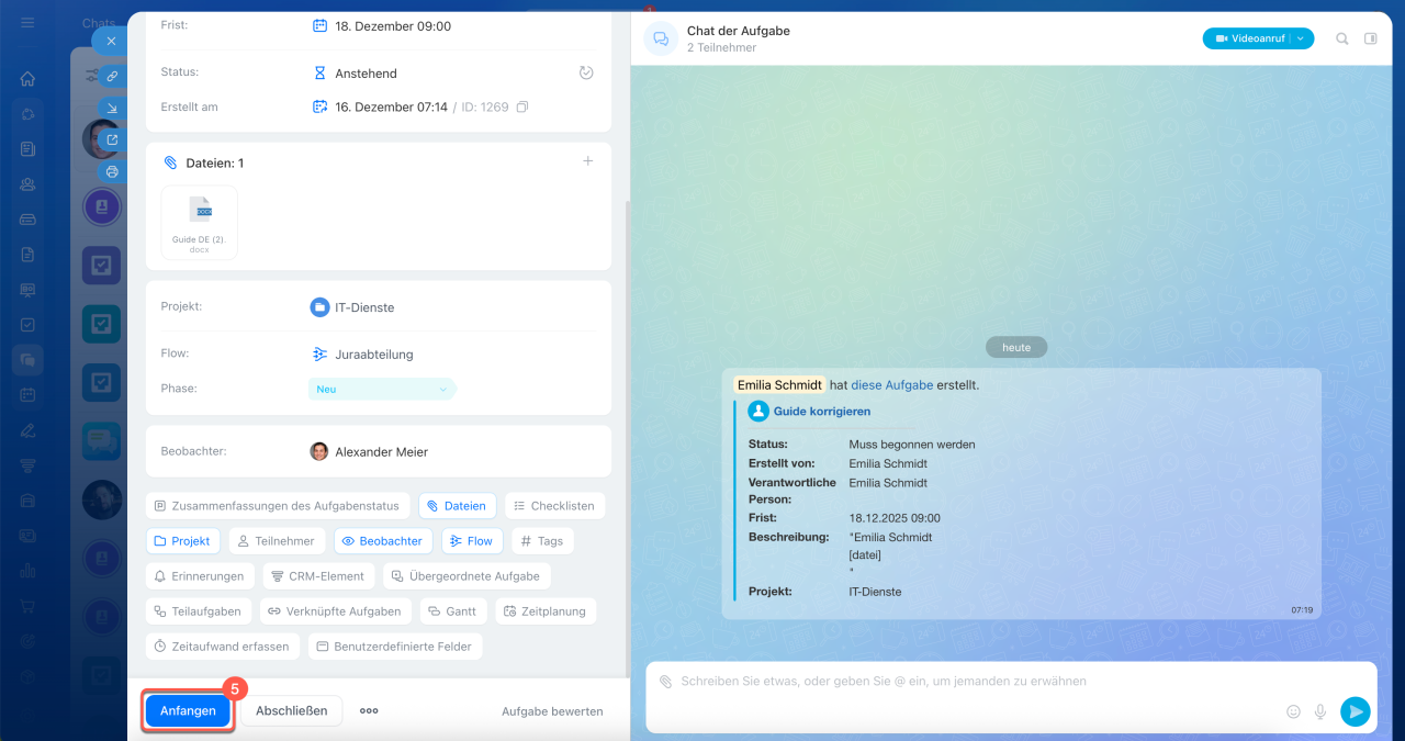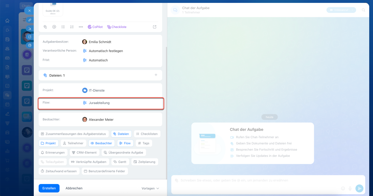 Andere Bitrix24-Tools. Um beispielhaft eine Aufgabe aus der Nachricht im Chat zu erstellen, klicken Sie auf Aufgabe erstellen und wählen Sie im Menü oben den Flow aus.