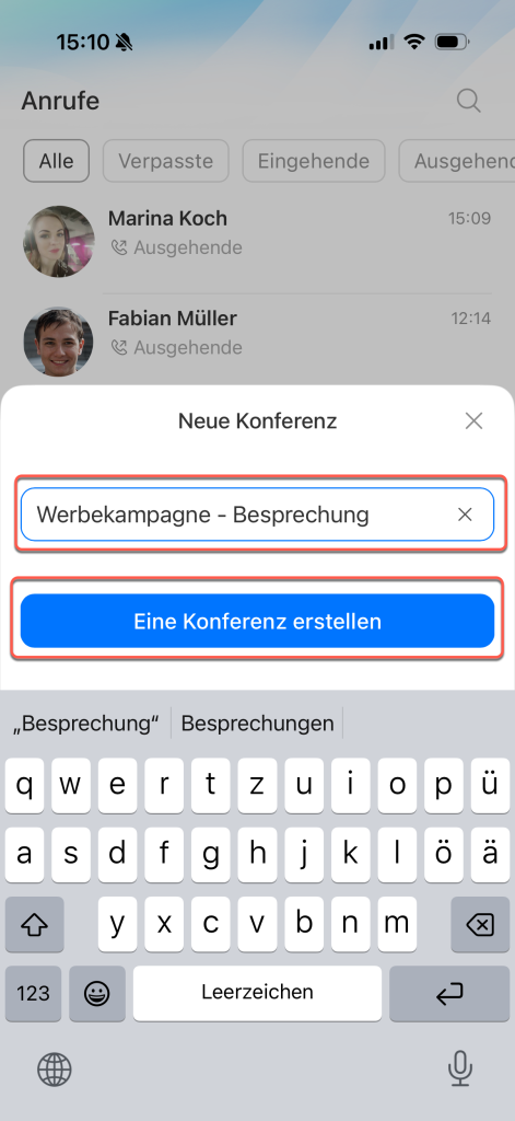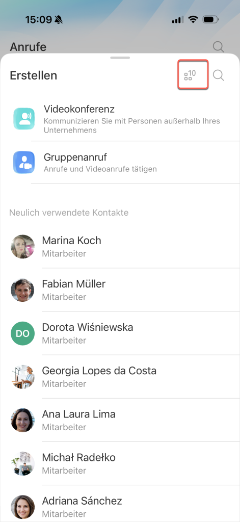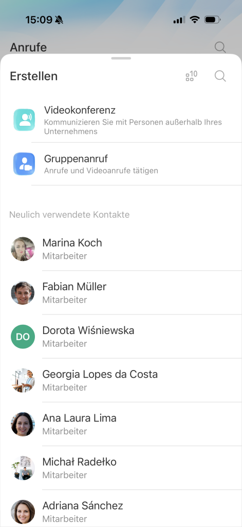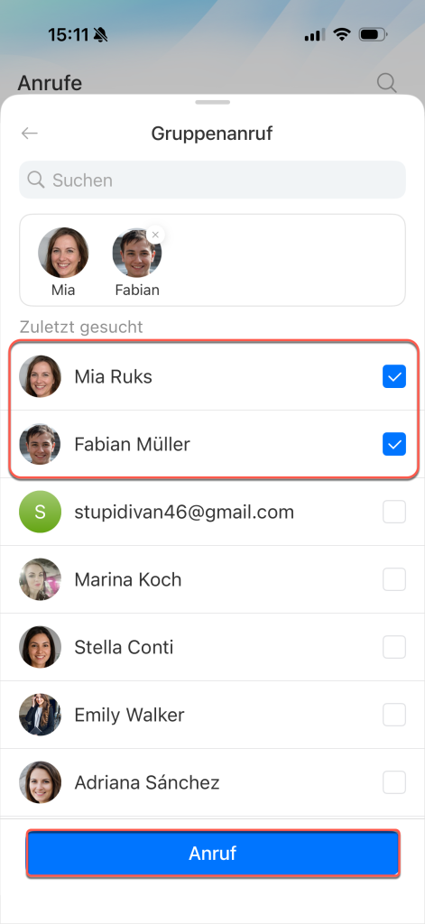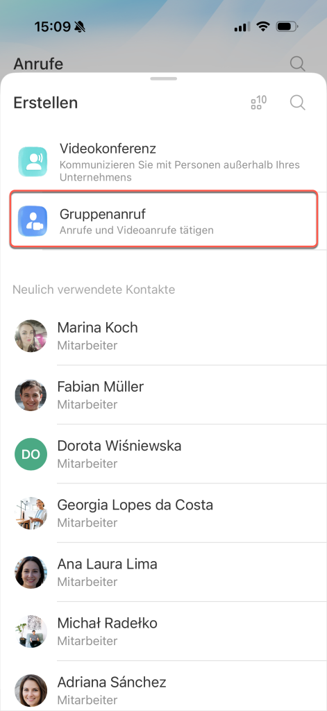 Gruppenanruf: Dies ist praktisch, wenn Sie eine Frage mit mehreren Kollegen besprechen müssen. Wählen Sie Gruppenanruf, geben Sie die Teilnehmer an und tippen Sie auf Anruf.